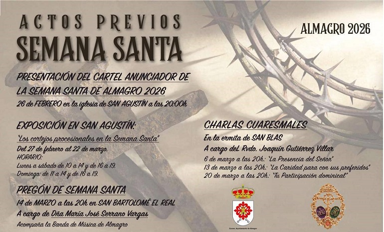 El 26 de febrero a las 20:00 horas, la Iglesia de San Agustín acogerá la presentación oficial del Cartel Anunciador de la Semana Santa de Almagro 2026, uno de los momentos más esperados del calendario cofrade.