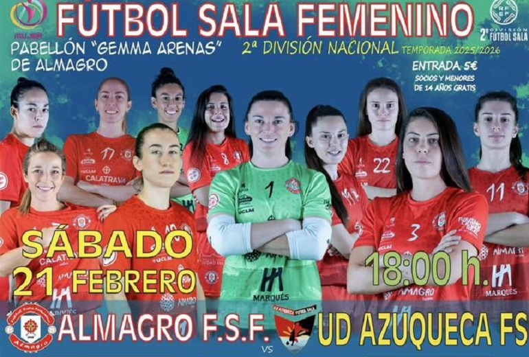 Este sábado 21 de febrero, a partir de las 18:00 horas, el Almagro FSF afronta un compromiso determinante ante el UD Azuqueca FS, correspondiente a la Jornada 20 del Grupo III de la Segunda División de Fútbol Sala Femenino, en el Pabellón Municipal Gemma Arenas.