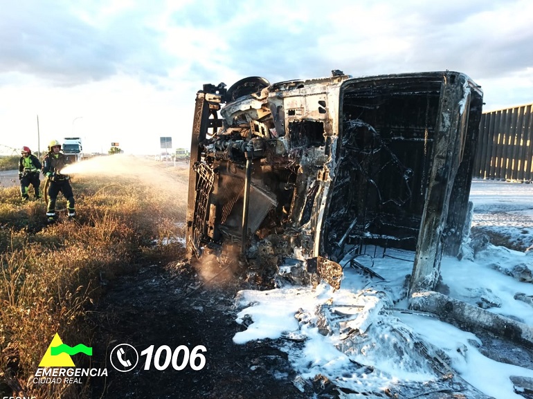 Según ha confirmado el Servicio de Emergencias 112 de Castilla-La Mancha, el siniestro se produjo sobre las 19:35 horas de este domingo, cuando un camión se salió de la vía por causas que aún se investigan, volcó sobre la calzada y comenzó a incendiarse. El fuego, que se propagó con rapidez, alcanzó la cabina del conductor, donde quedó atrapada la única persona implicada en el accidente. A pesar del rápido despliegue de medios de emergencia, no se pudo hacer nada por salvarle la vida.